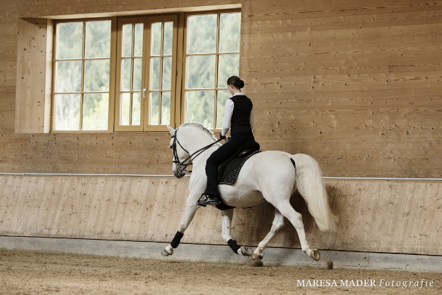 - Vera Mundloh auf Lippizanerhengst Favory in der Trabverstärkung
