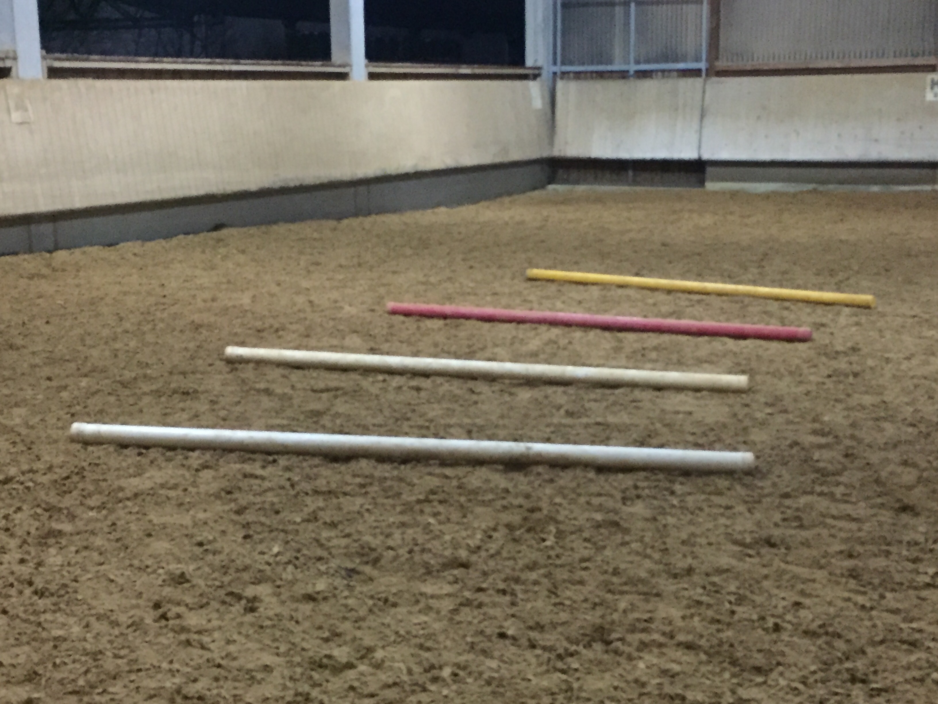 Es gab Schritt- und Trabstangen und ein Konstrukt, in dem man auch in der Mitte anhalten, eine viertel Vorhandwende reiten und über eine erhöhte Stange raus reiten konnte.