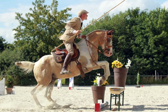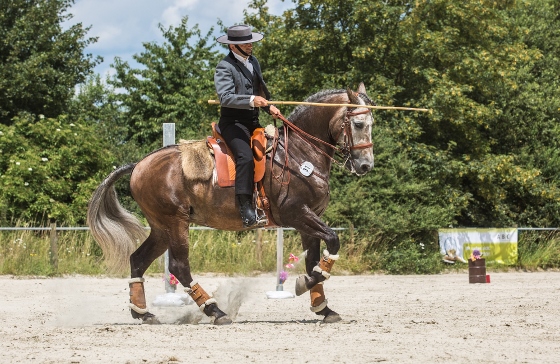 Zum Beispiel mit einer Garrochastange in der Hand über eine Bierbank springen und den Slalom meistern. Oder im gestreckten Galopp über eine Brücke, die von einem Teich mit schwimmenden Plastikenten gesäumt ist. Ein Hindernis, das in der Klasse L viele der Pferde gar nicht passieren wollten.